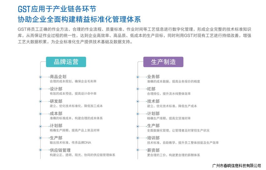 GST帮助企业建立工艺数据库,建立全面的知识管理,助力企业数据化,标准化,科学化管理,让应用成本下降,构建时代万恒精益标准化管理体系,打造有竞争力的纺织服装生态链。